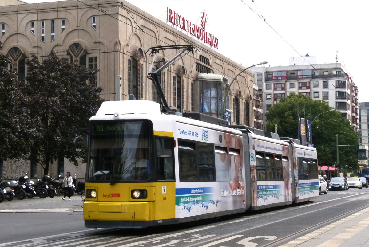 13. August 2014, Berlin, Zug 1095 der BVG (AEG Großraum-Gelenk-Niederflurwagen) vor dem Friedrichstadtpalast.
