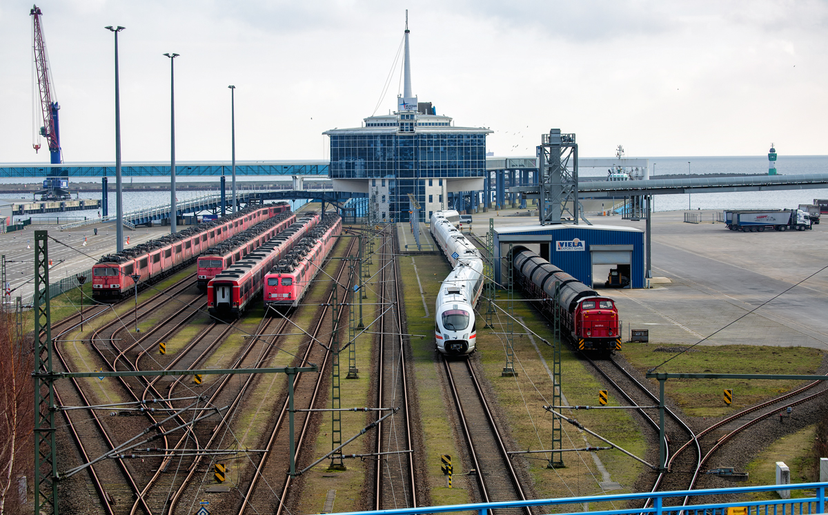 Lok 346 975 mit Tads Wagen zur Entladung im Fährhafen Sassnitz Mukran, daneben stehen zum Verkauf ICE’s TD (BR 605), die auf der Vogelfluglinie eingesetzt waren. - 04.03.2020