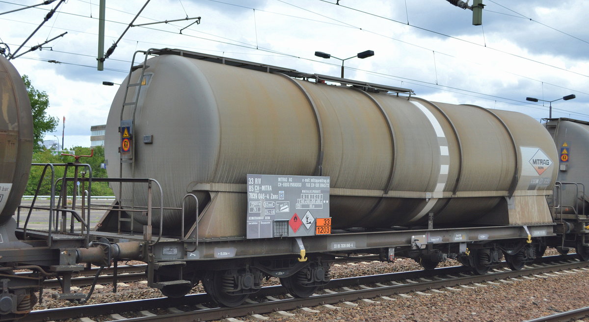 Kesselwagen aus der Schweiz der MITRAG AG mit der Nr. 33 RIV 85 CH-MITRA 7839 045-4 Zans Befüllung: siehe UN-Nr.: 33/1203 = Benzin am 12.05.20 in einem Kesselwagenzug Bf. Flughafen Berlin Schönefeld.