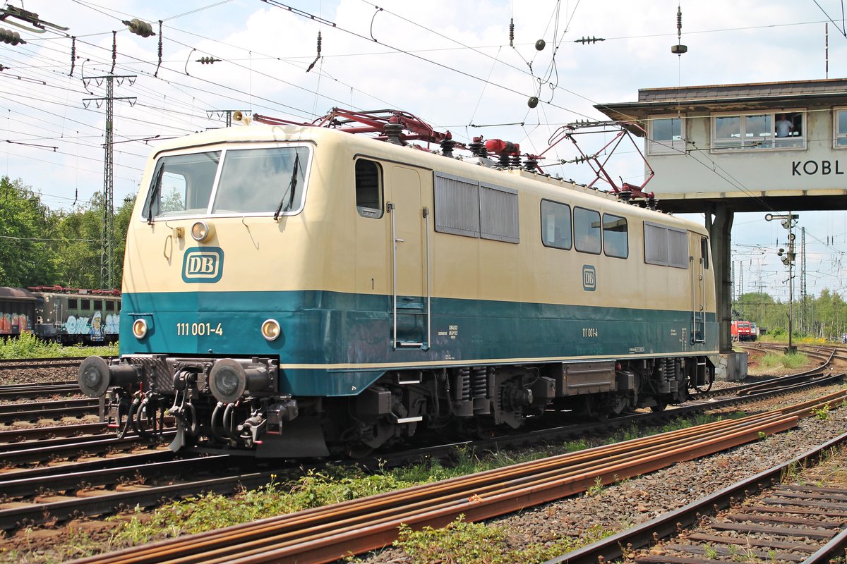 Portrait von 111 001-4, als diese am Nachmittag des 22.06.2019 an der Fahrzeugparade des Sommerfestes vom DB Museum in Koblenz Lützel teilnahm.
