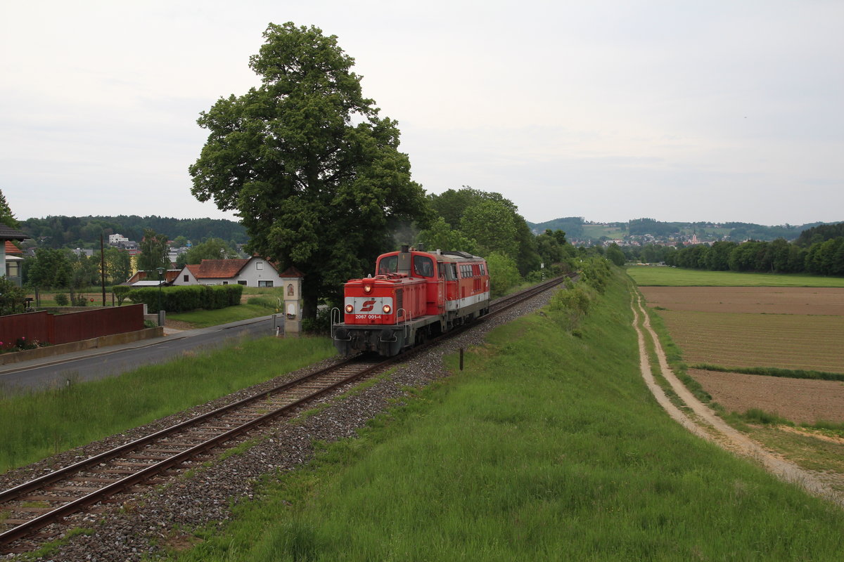 So fuhren am 19.5.2020 die 2067 001 und die 2143 029 als SLZ18199 kurz hinter Gleisdorf in Richtung Graz auf die Laßnitzhöhe.