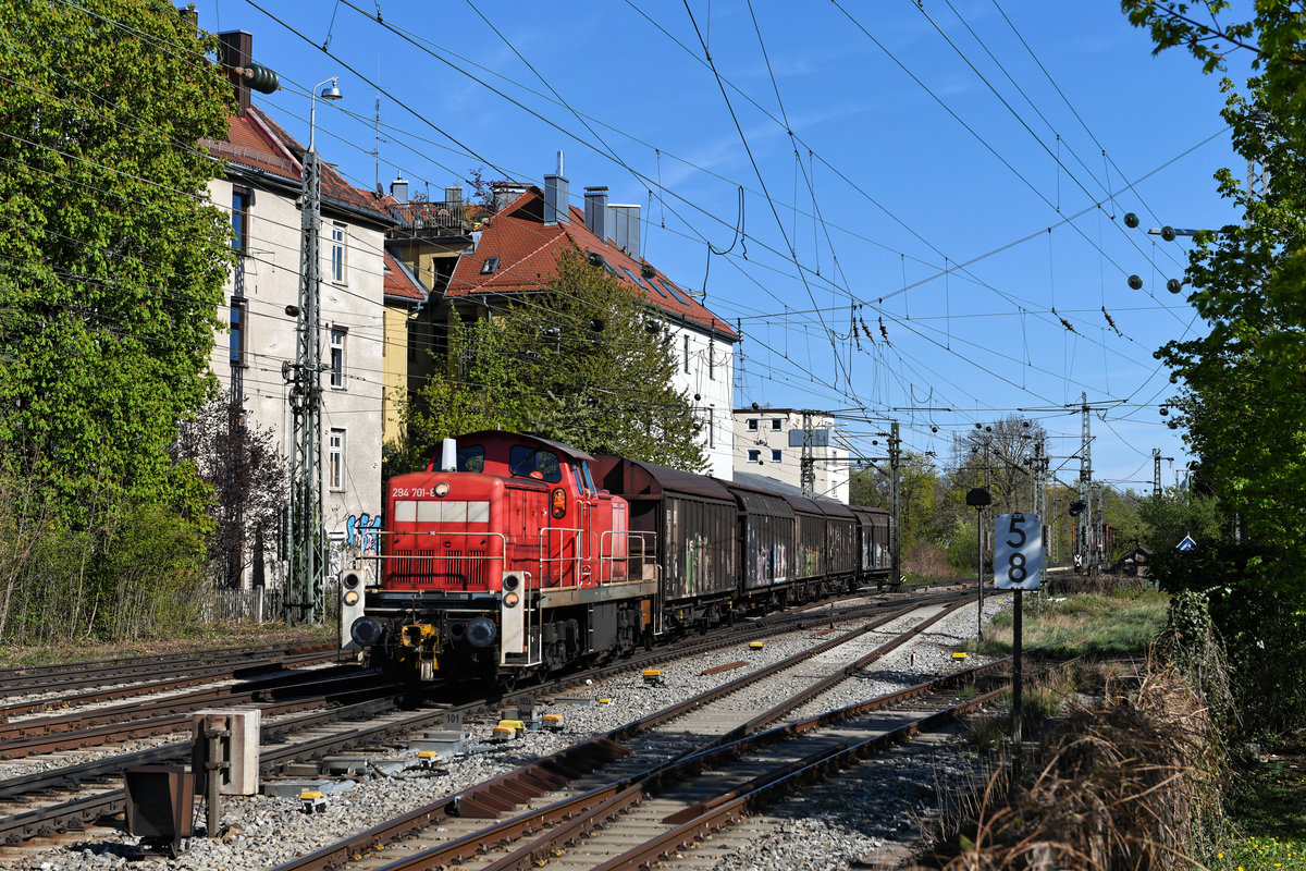 Am 15. April 2020 konnte ich die 294 701 mit der Übergabe aus Feldkirchen bei der Einfahrt in den Bahnhof München Süd aufnehmen. So ein Bild mutet inzwischen nostalgisch an. In der bayerischen Ladeshauptstadt gibt es inzwischen kaum noch bediente Anschlüsse mit Einzelwagenverkehr.