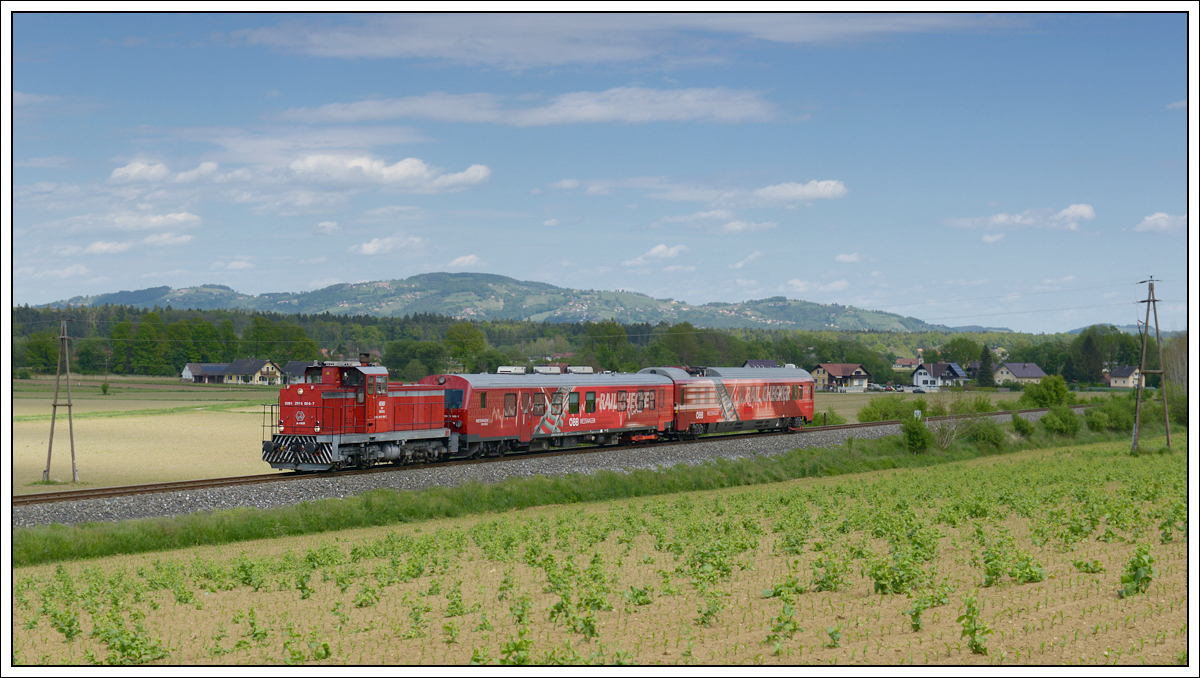 Gestern, am 4.5.2020, war GKB 1500.6 mit den beiden ÖBB Infra Oberbau-Messwagen EM 250 und EM 160 WZ vulgo Rail Checker auf dem Netz der GKB unterwegs. Beim ersten Bild noch Glück mit einem Sonnenloch, hatte ich das Glück bei den beiden anderen Fotostellen leider nicht mehr. Hier als LP 61383 von Lieboch nach Wies-Eibiswald in Leibenfeld kurz nach Deutschlandsberg