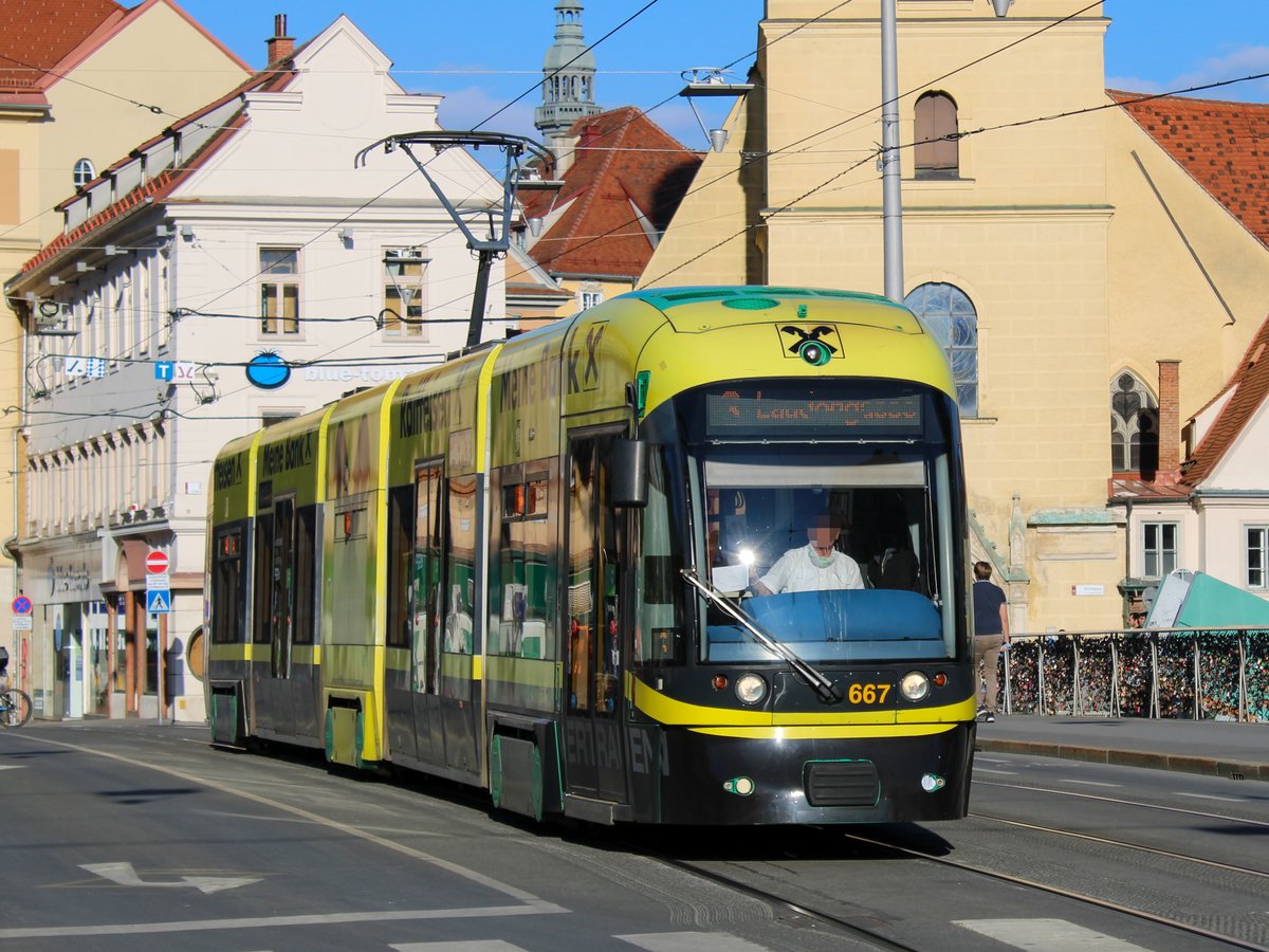 Graz. Am 06.05.2020 war Cityrunner 667 auf der Linie 3 unterwegs, hier auf der Murbrücke bzw. Erzherzog-Johann-Brücke auf dem Weg Richtung Laudongasse