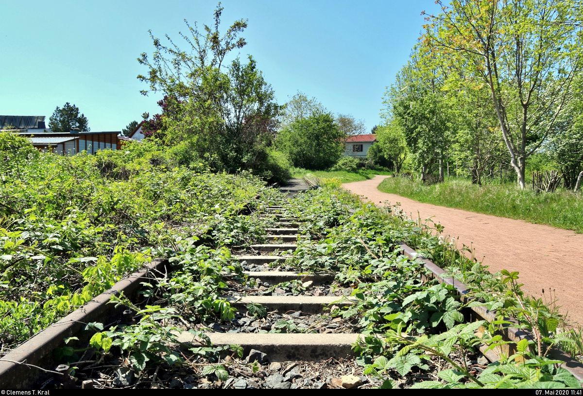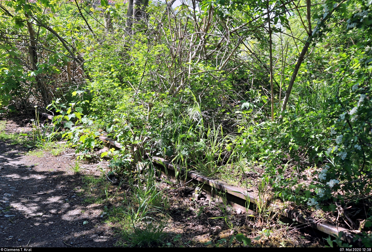 Auf einem kleinen Stück zeigen sich hier zum ersten Mal Schienen - zumindest deren zugewachsenen Überbleibsel. Unweit dieses Standorts besteht auch ein kleiner Trampelpfad quer über das Gleis.
