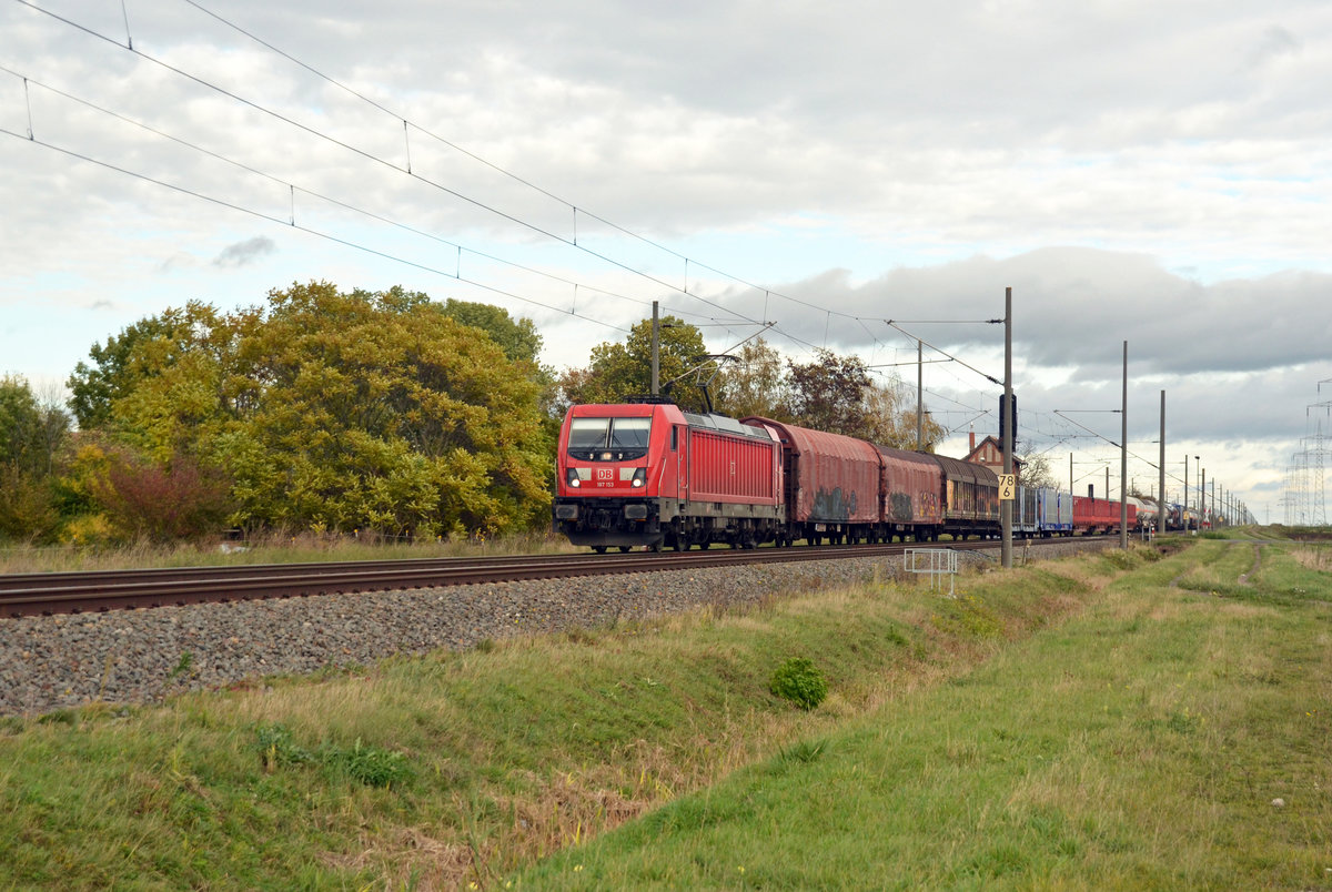 Mit einem gemischten Güterzug am Haken rollt 187 153 am 28.10.20 durch Braschwitz Richtung Halle(S) Rbf.