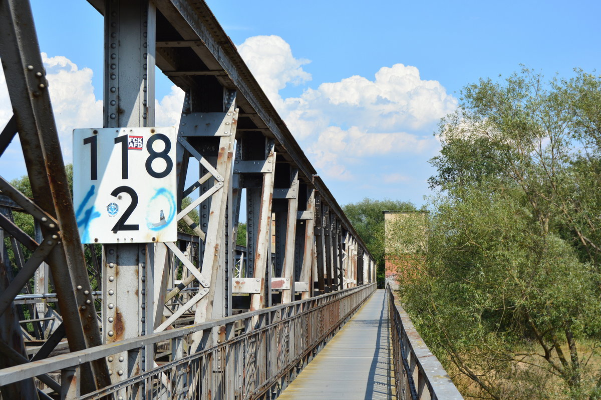 118.2 Kilometer bis Berlin Charlottenburg. Blick über die alte Elbbrücke in Barby. Seit 2004 ist hier die Kanonenbahn ab Wiesenburg bis Barby stillgelegt und weitesgehend komplett abgebaut.