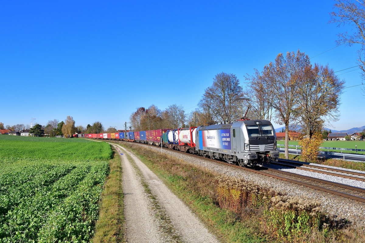 Am Nachmittag des 28.10.2020, dem letzten Mittwoch des Oktobers 2020, durchfährt Vectron 193 225 von ELL, vermietet an ECCO, mit dem Ekol-Zug nach Trieste den Bahnhof von Aßling in Oberbayern.