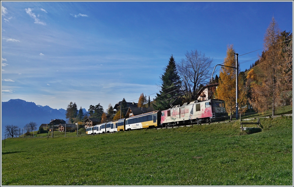Kurz nach Les Charbonnières ist der TRAVY Regionalzug 6019 auf dem Weg nach Le Brassus. Der Zug besteht aus dem führenden Steuerwagen ABt NPZ DO TR 50 85 39-43 984-6 CH-TVYS, dem nachfolgenden Zwischenwagen B NPZ DO TR 50 85 29-43 384-1 CH-TVYS und dem schiebenden TRAVYS RBDe 560 384 (UIC RBDe 560 DO TR 94 7 560 384-0 CH-TVYS). Im Hintergrund ist der Lac Brenet zu erkennen.