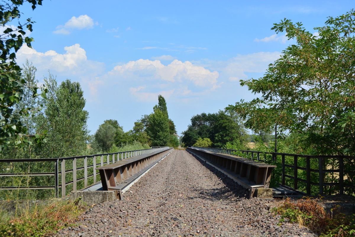 Blick über die 1992 bis 1993 neu gebaute Flutbrücke Flötz. Links erkennt man gut die an die Brückenpfeiler gegossenen Fundamente für die damals geplante Elektrifizierung bis Güsten. Leider kam es hier nie zur Elektrifizierung und die Pläne wurden nach dem Mauerfall verworfen.