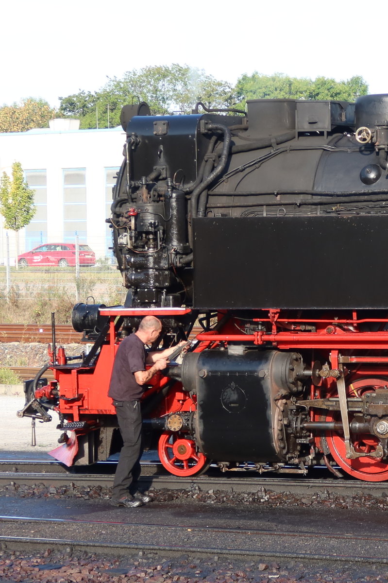 Jubiläumslok 99 236 der HSB wird in der Morgensonne des 15. September 2020 vor dem Lokschuppen im BW Wernigerode auf einen anstrengenden Betriebstag vorbereitet