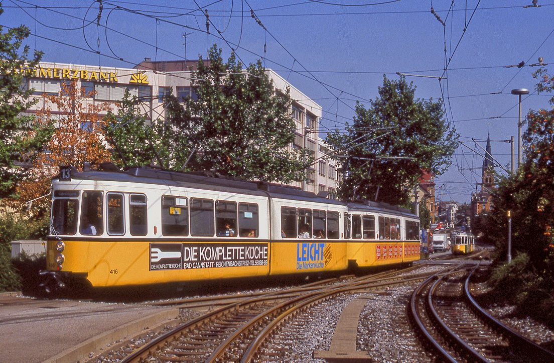 02. August 2003	Cottbus, Tw 130 der Straßenbahn bedient die Linie 2 und biegt vor der Stadthalle aus der Berliner in die Friedrich-Ebert-Straße ein. Scan vom Color-Negativ