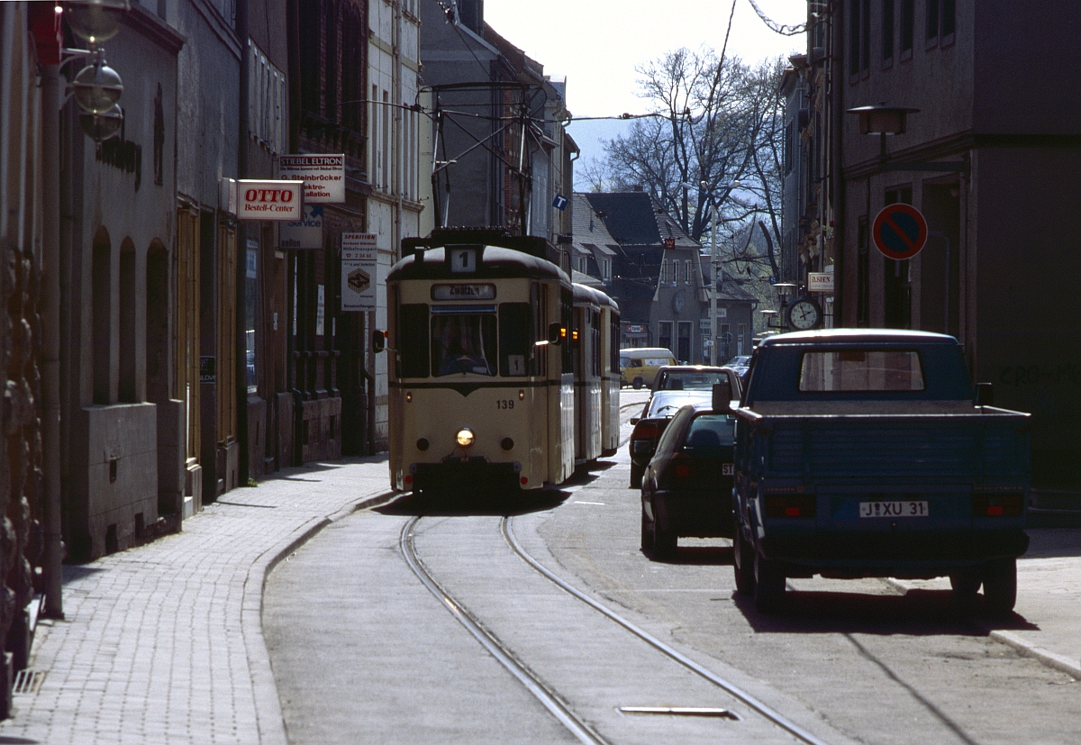 KT4D Tw 301 fährt durch Gotha Sundhausen vorbei an Garagenhöfen und Kleingärten.