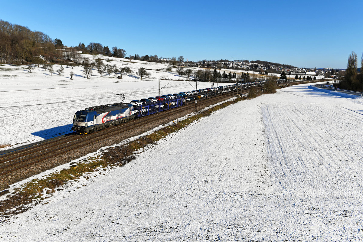 Die von ZSSK Vectrons geführten Gefco Autotransportzüge gehören inzwischen zum gewohnten Bild in Süddeutschland. Mit diesen werden Neuwagen aus dem slowakischen Werk des PSA-Konzerns nach Frankreich transportiert. Bei der Rückfahrt sind häufig Fahrzeuge für den osteuropäischen Markt geladen. Die Laufwege der Züge zwischen Passau und der französichen Grenze sind höchst unterschiedlich. Regulär wird über Landshut, München und die Geislinger Steige gefahren. So auch am 13. Februar 2021, als ich die 383 202 mit einem relativ kurzen, aber komplett beladenen Zug bei Nassachmühle im schneebedeckten Filstal aufnehmen konnte.