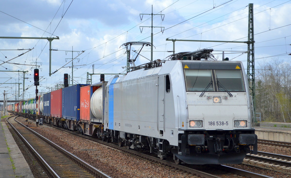 METRANS Rail s.r.o., Praha [CZ] mit der Akiem Lok "186 363-8" [NVR-Nummer: 91 80 6186 363-8 D-AKIEM] und Containerzug am 20.04.21 Durchfahrt Bf, Golm (Potsdam) Richtung Norden.