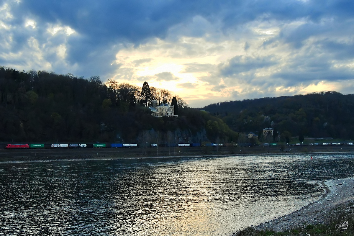 Die Elektrolokomotive 185 229-2 zog Anfang April 2021 einen Containerzug, so gesehen auf der linken Rheinstrecke bei Remagen.
