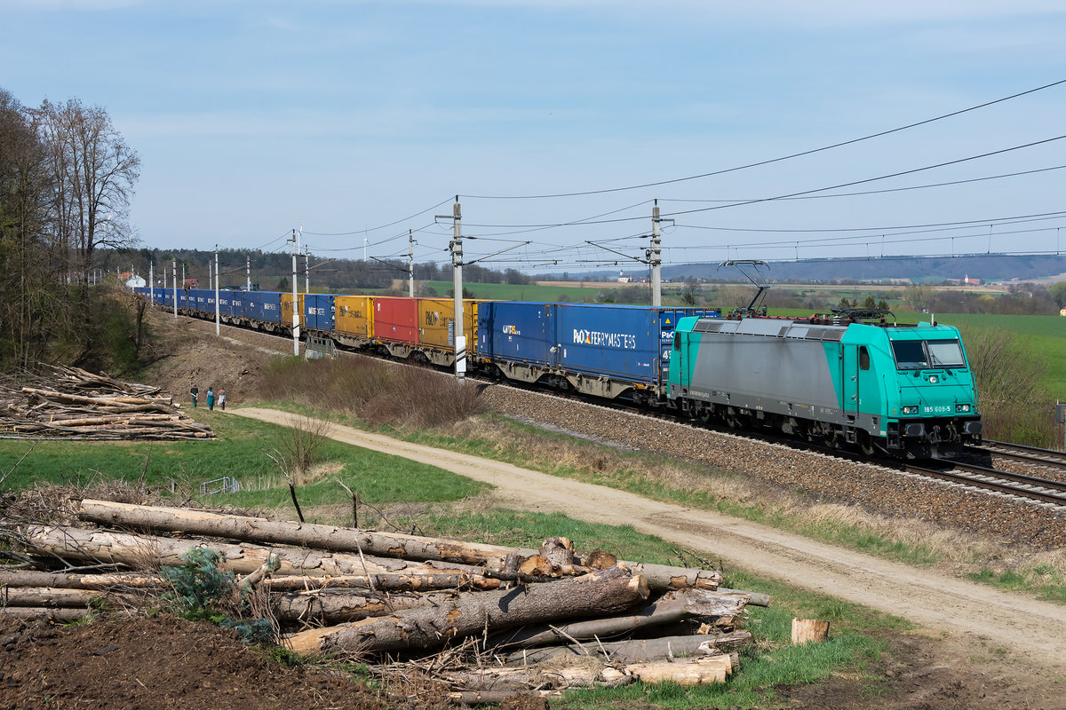 185 609 war am 10.04.2021 mit Containern auf der alten Westbahnstrecke in Richtung Wien unterwegs. Das Foto enstand bei Weisching.