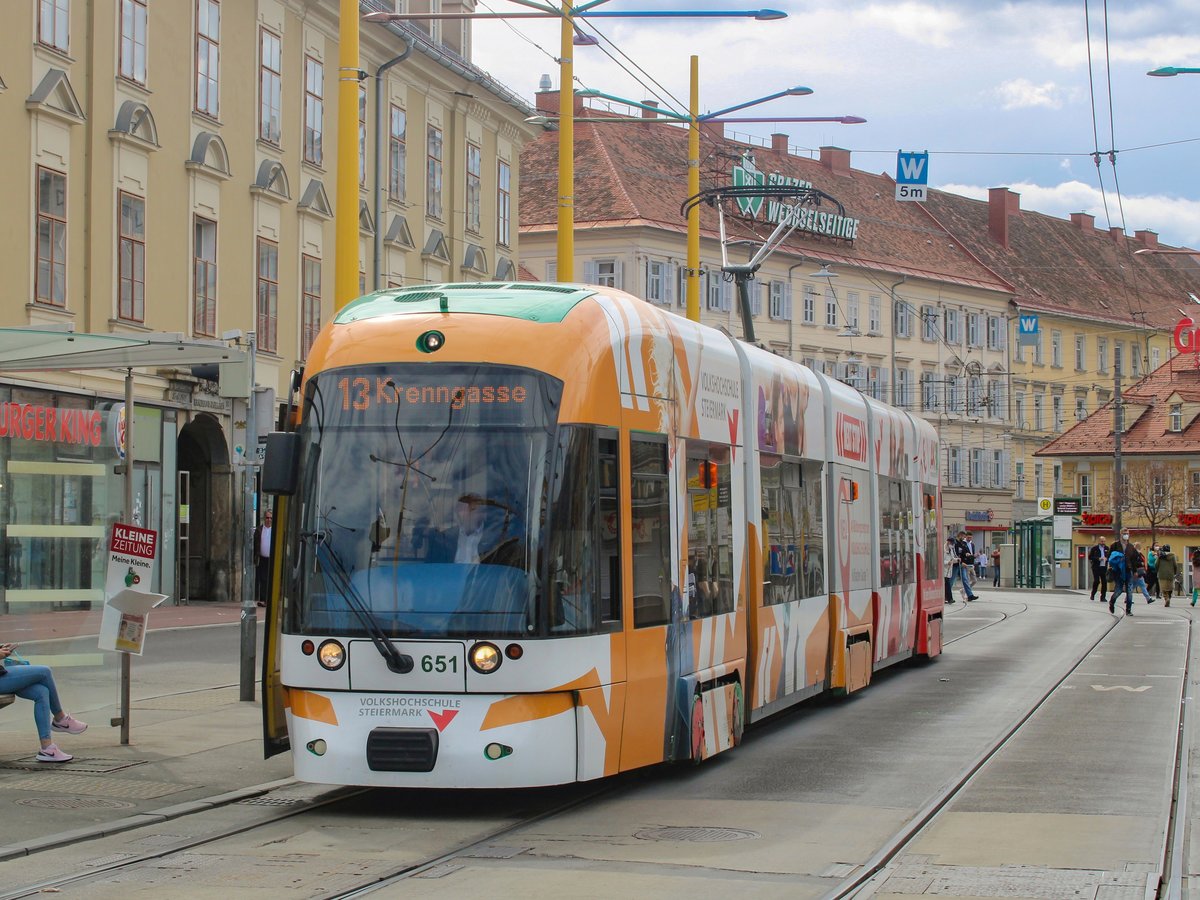 Graz. Variobahn 232 der Graz Linien war am 10.04.2021 auf der Linie 5 unterwegs, hier kurz vor der Haltestelle Jakominigürtel/TIM.