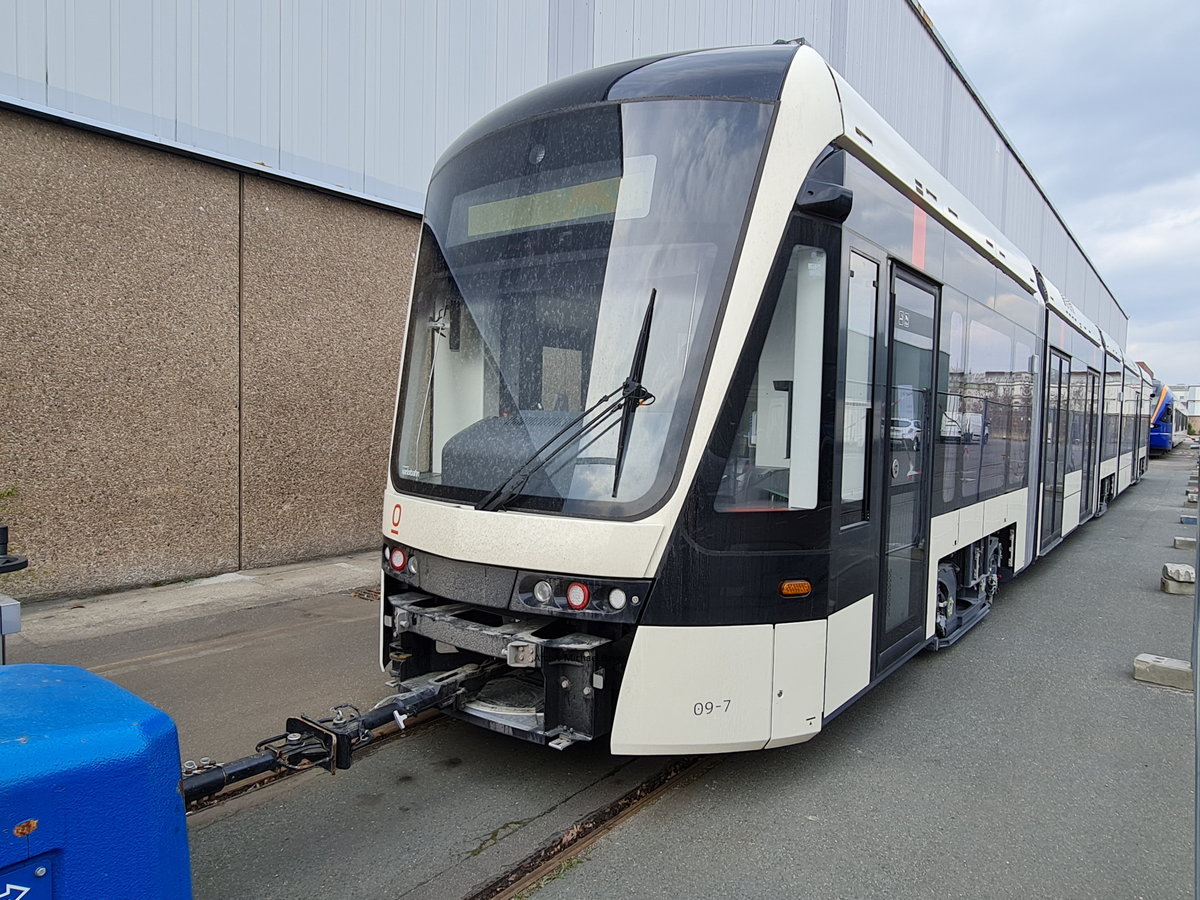 Neben der Werkhalle von Stadler in Berlin-Reinickendorf steht am 09.04.2021 die danische Variobahn. Die Straßenbahn mit den Nummern 09-1 und 09-7 ist normalerweise auf der dänischen Insel Fünen als Stadtbahn (Letbane) im Einsatz.