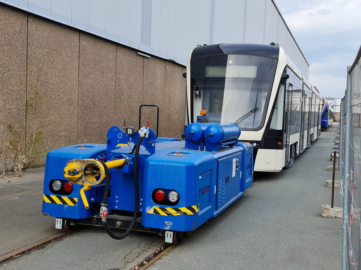 Neben der Werkhalle von Stadler in Berlin-Reinickendorf steht am 09.04.2021 die danische Variobahn zusammen mit dem ZAGRO XL-Rangiergerät. Die Straßenbahn 09-1 ist normalerweise auf der dänischen Insel Fünen als Stadtbahn (Letbane) im Einsatz.