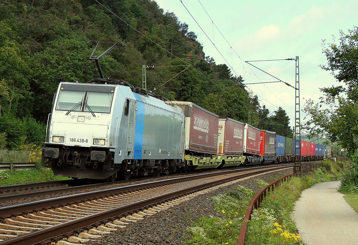 193 263 im Einsatz für "LTE" mit einem Containerzug am 22. Juli 2021 bei St. Goarshausen am Rhein.