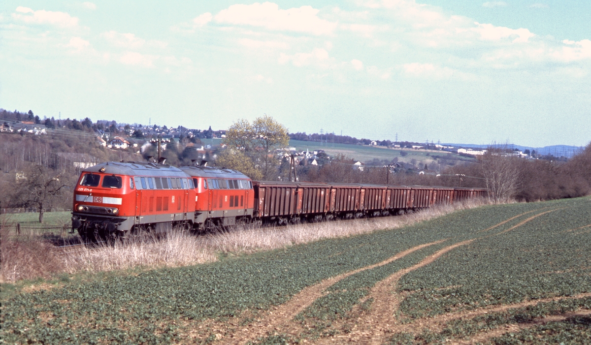 225 071 und eine Schwestermaschine bringen bei Staffel einen leeren Tonzug in Richtung Montabaur (7.4.2006).