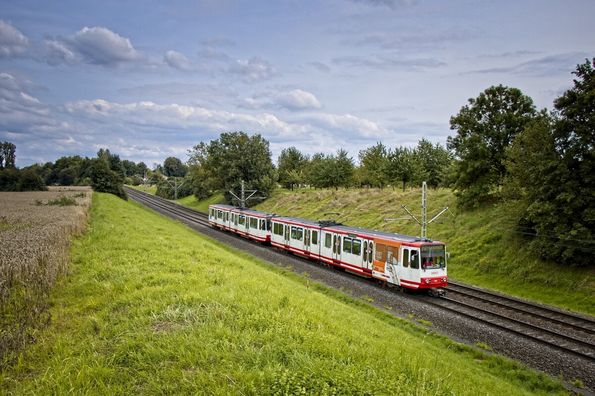 Der Elektrotriebzug ET 6.01 war Ende April 2021 auf dem Ferngleis in Wuppertal-Unterbarmen unterwegs.