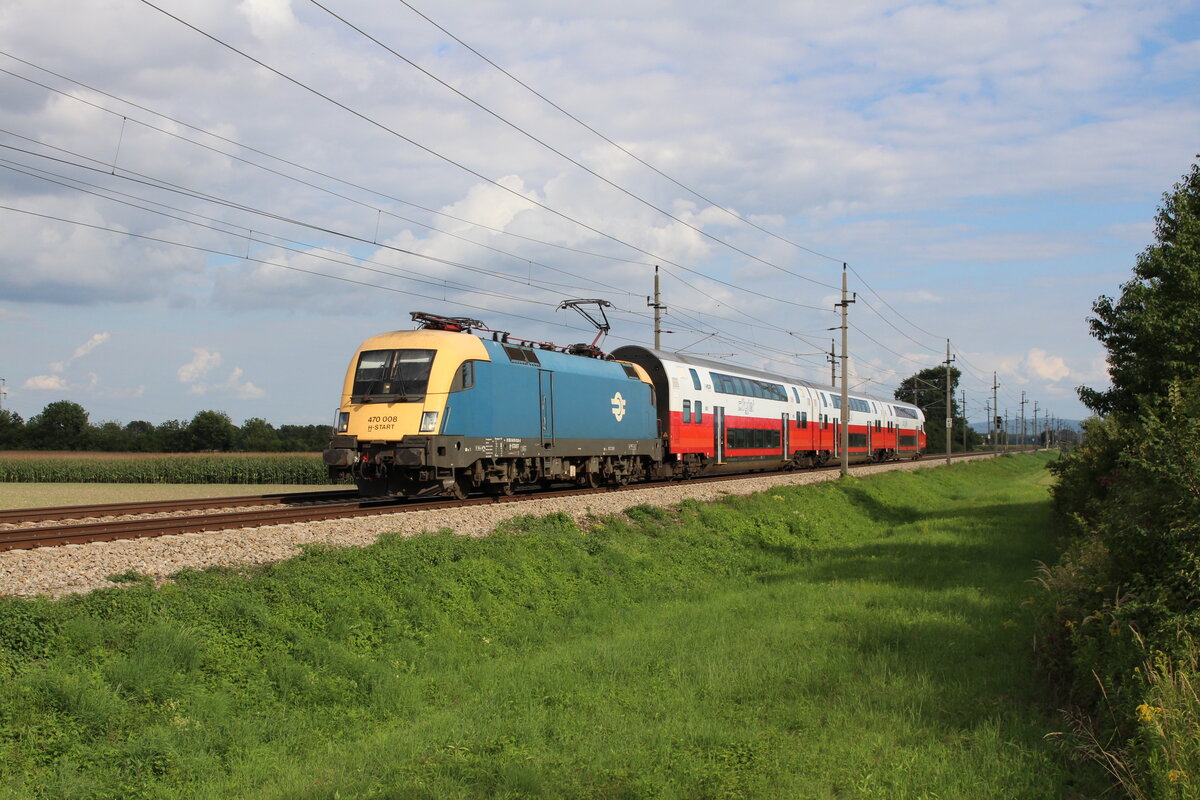 Die 470 008 der Magyar Államvasutak (MÁV) durchfährt mit dem REX2118 am 19.8.2021 kurz vor Absdorf-Hippersdorf die Weiten des Tullnerfeldes von Wien Franz-Josefs-Bahnhof kommend in Richtung České Velenice.