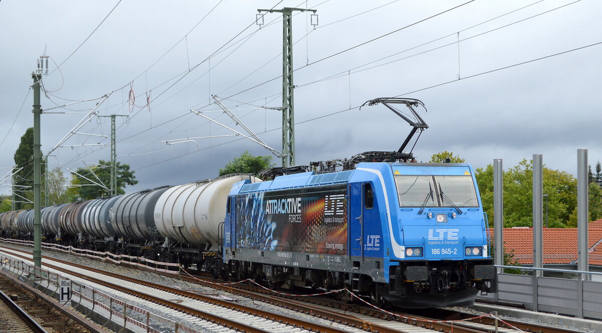 HSL mit "186 533-6" (NVR: "91 80 6 186 533-6 D-Rpool") und "185 600-4" (NVR: "91 80 6 185 600-4 D-BRLL") und Kesselwagenzug (leer) Richtung Stendell am 20.08.21 Berlin Buch.
