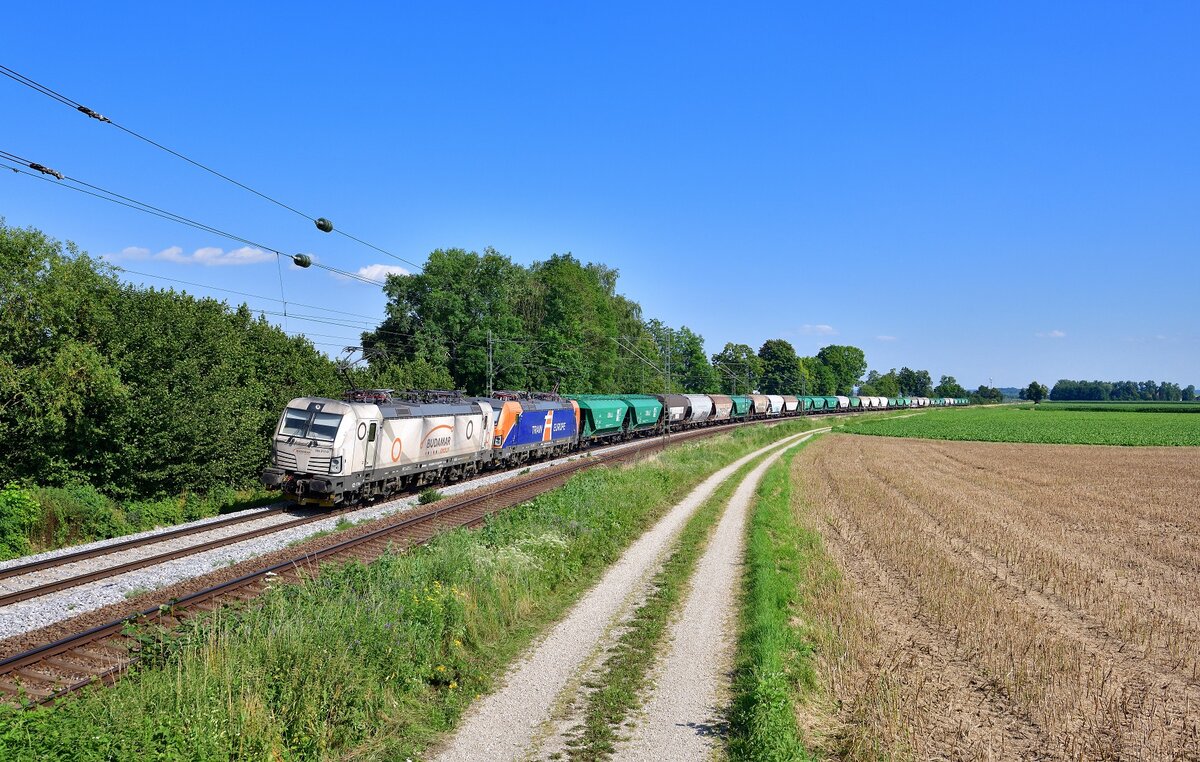 383 211 + 193 741 mit einem Getreidezug am 22.07.2021 bei Langenisarhofen.