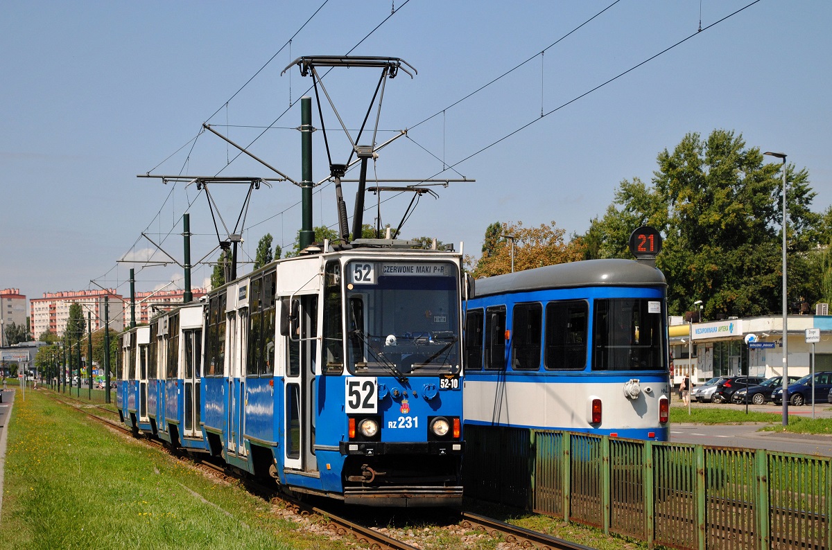 Ein Dreifachzug der Linie 52, bestehend aus den Tw.213 + 235 + 236 hält in ul. Lubicz an der Haltestelle Rakowicka. (19.08.2021)