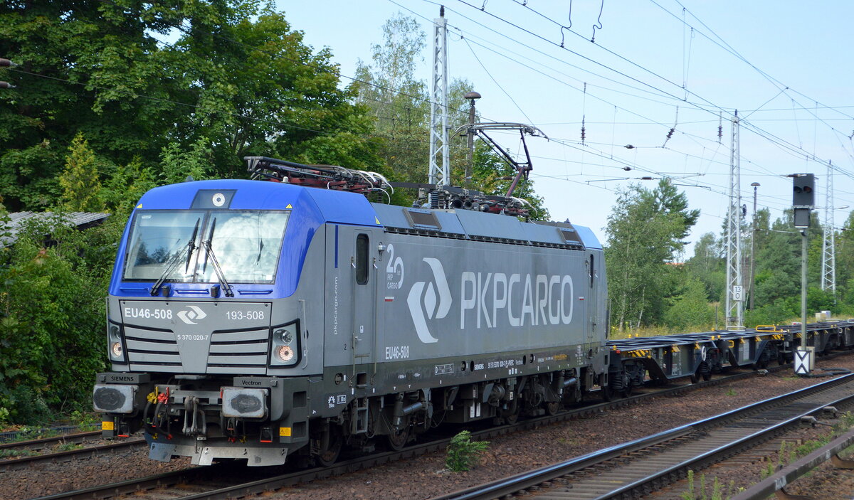 Anlässlich des 20 jährigem Betriebsjubiläum der polnischen PKP Cargo hat sie ihrer Vectron Flotte nun zum Teil an den Dachfrontseiten eine blaue Lackierung anstelle des dunkelroten Lacks angebracht, sieht besser aus finde ich persönlich, hier "EU46-508" [NVR-Nummer: 91 51 5370 020-7 PL-PKPC] mit Ganzzug Containertragwagen (leer) Richtung Polen am 06.08.21 Berlin Hirschgarten.