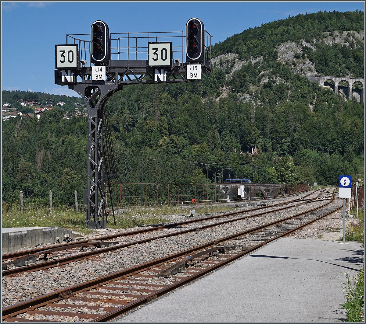 Der Besuch im nur 1500 m (Luftline) weit entfernten Bahnhof von Morez (hier im Bild) brachte dann Klarheit. Auf die Frage: "Wann fährt ein Zug" antworte der Fahrdienstleiter mit: "Wohin?" Und meine Antwort "Irgendwohin" liess gleich erkennen, dass er vom Fach ist und er nannte mir die Fahrzeit in Morez (12:07) und beim Viaduc des Crottes (11:58), welches im Bild ganz rechts oben zu erkennen ist.