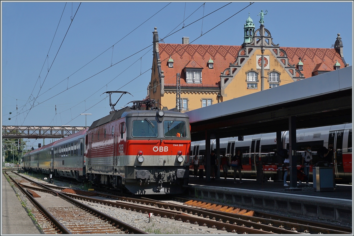 Die ÖBB 1144 280 ist mit ihrem IC 118 "Bodensee" in Lindau Insel angekommen. Heute endet der Zug hier.