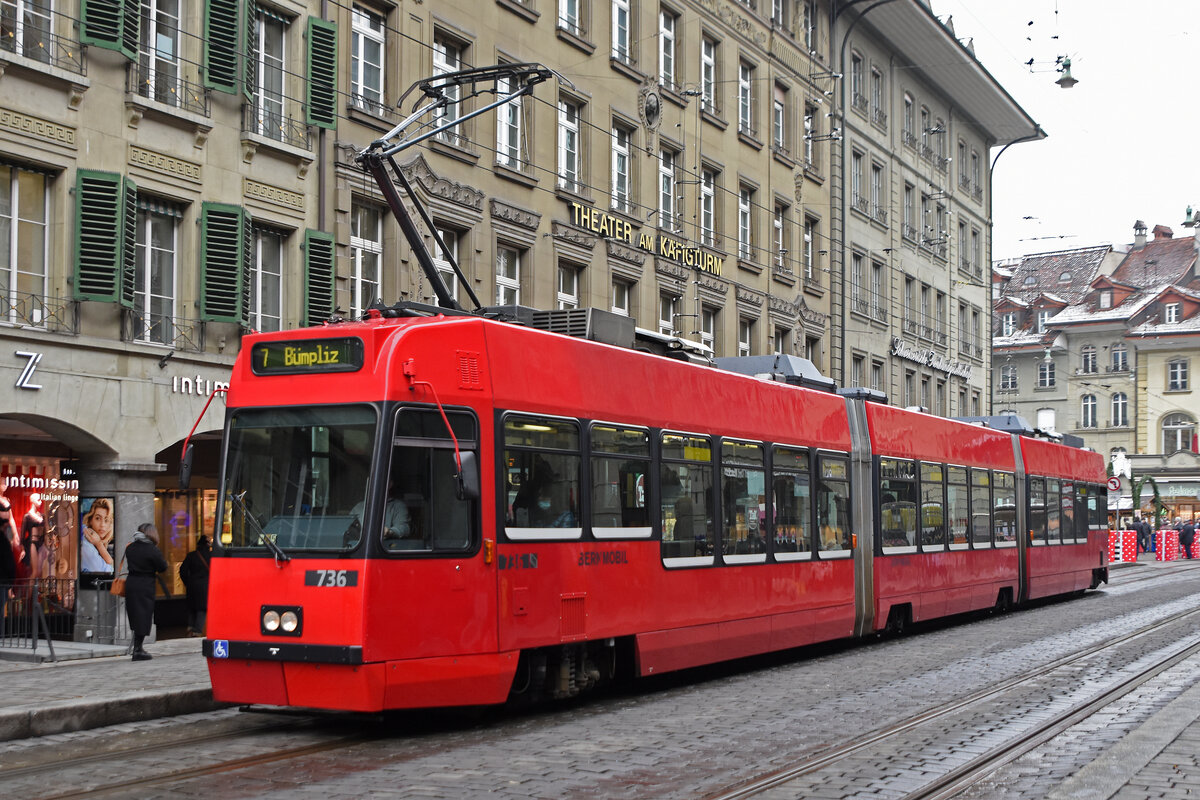 Be 4/6 Vevey Tram 736, auf der Linie 7, bedient die Haltestelle Bärenplatz. Die Aufnahme stammt vom 06.12.2021.