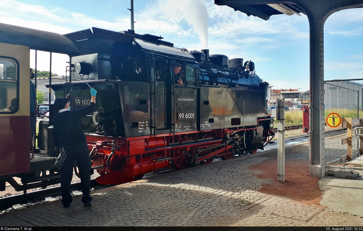 Abfahrt für 99 6001-4 im Startbahnhof Quedlinburg auf dem Schmalspurgleis. Die Zugbegleiterin signalisiert dem Lokführer, dass es losgehen kann. 🧰 Harzer Schmalspurbahnen GmbH (HSB) 🚝 HSB 8963 Quedlinburg–Alexisbad 🚩 Bahnstrecke Quedlinburg–Gernrode–Hasselfelde (Selketalbahn | KBS 333) 🕓 25.8.2021 | 10:32 Uhr (Smartphone-Aufnahme)