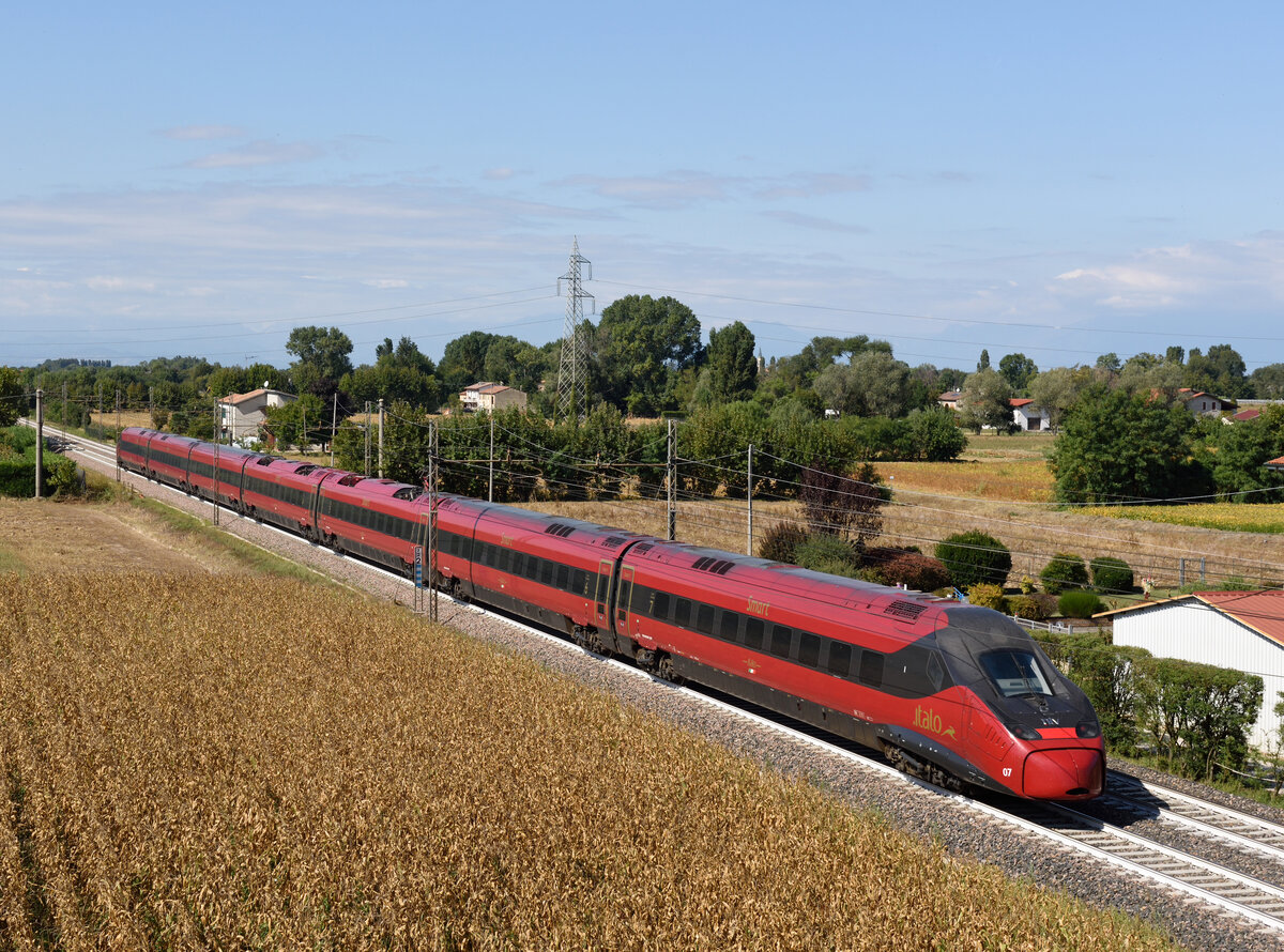 Der hamsterbäckige ETR 675 007 italo EVO war zum Mittag des 13. September 2021 als Zug 8982 von Venezia Santa Lucia nach Torino Porta Nuova unterwegs, und wurde von mir in Mestrino fotografiert.