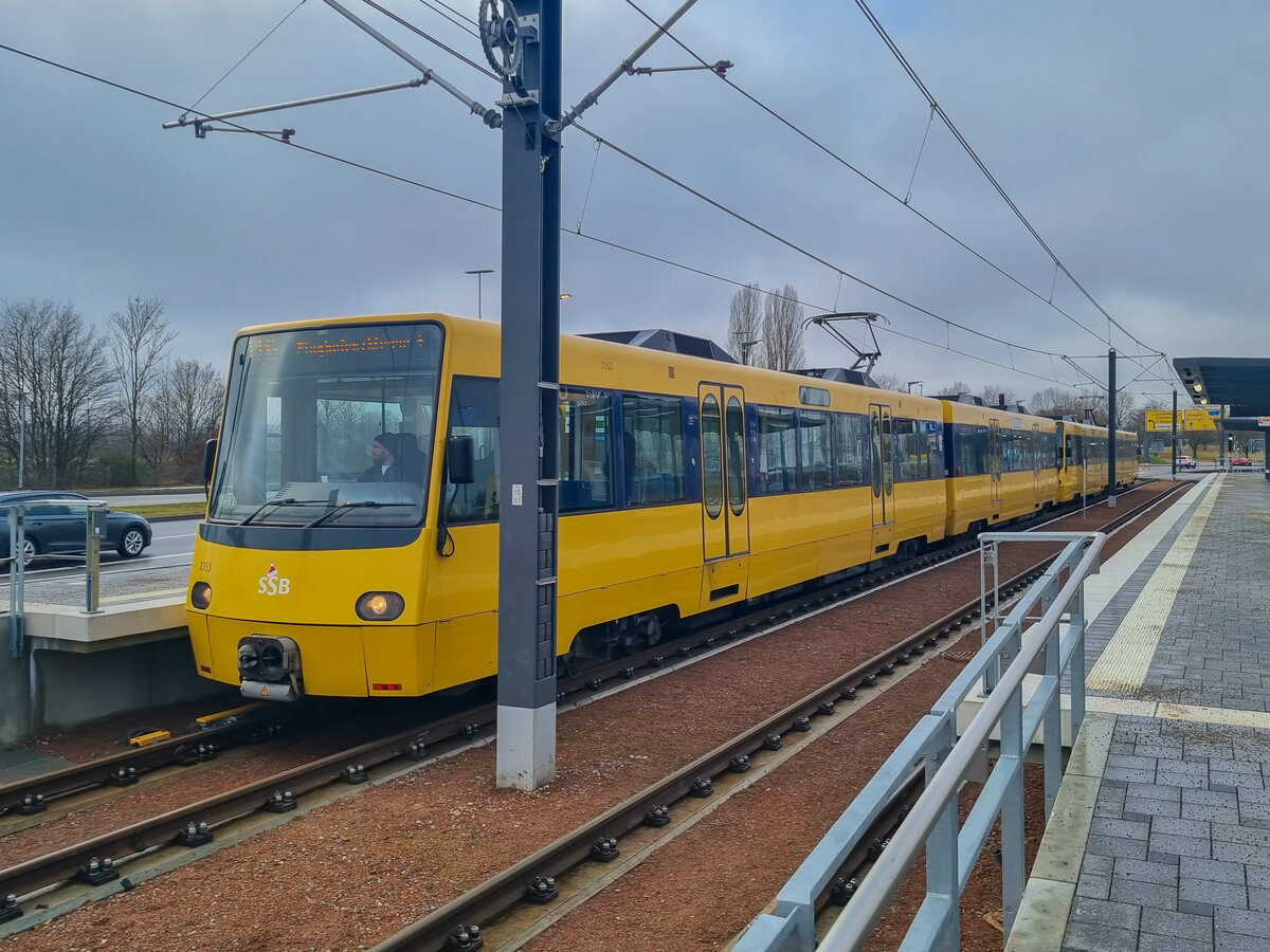 SSB DT 4163 mit der U6 nach Gerlingen in der neuen Endstation Flughafen/Messe, 13.12.2021.