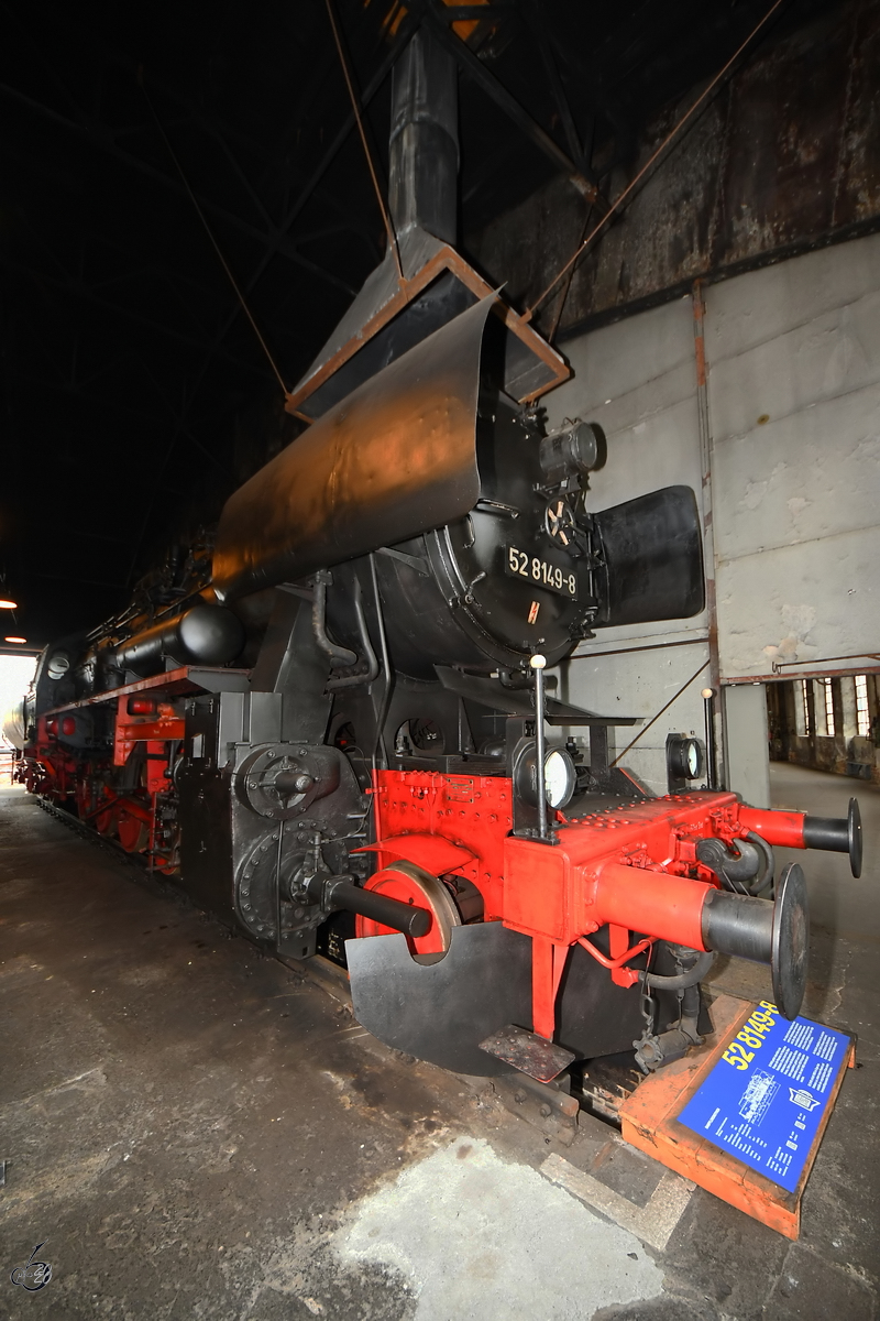 In einem der beiden Rundlokschuppen des Sächsischen Eisenbahnmuseums in Chemnitz-Hilbersdorf ist die Dampfllokomotive 52 8149-8 zu sehen. (September 2020)