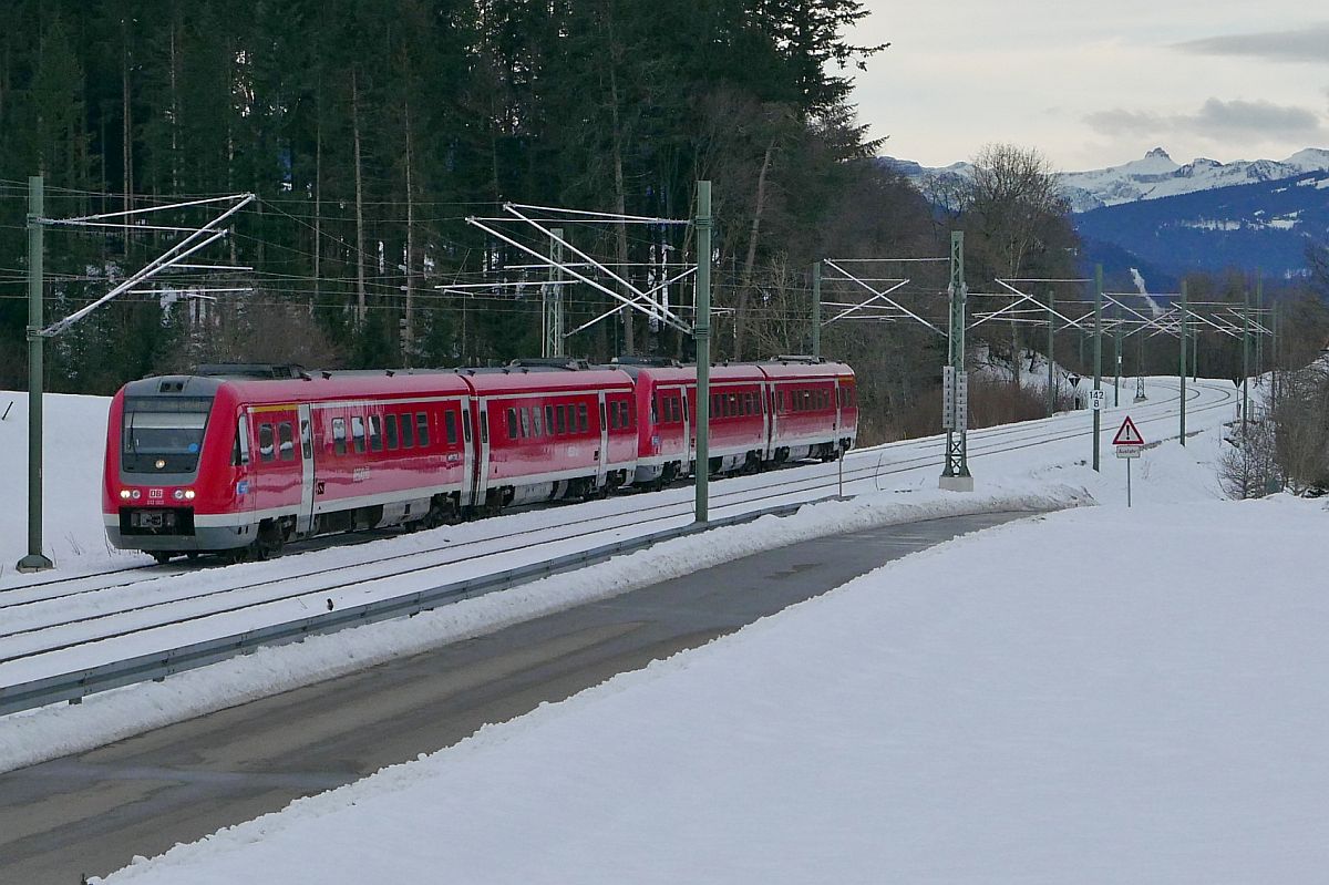 Bei Höhenreute befinden sich 612 003 und ein weiterer Triebwagen am 22.01.2021 als RE 7 / RE 3288 auf der Fahrt von Augsburg über Lindau-Insel nach Lindau-Reutin