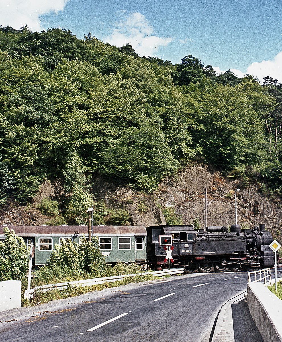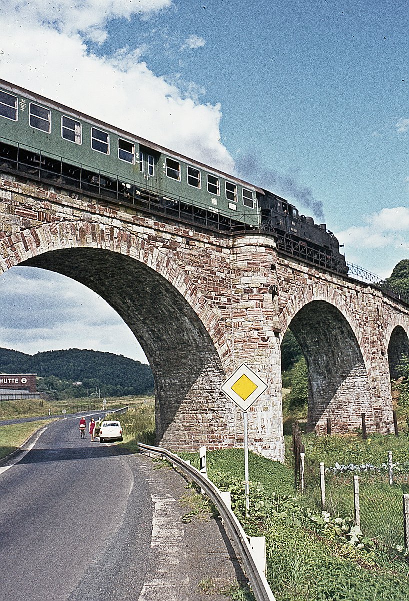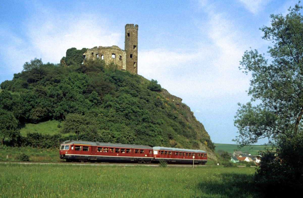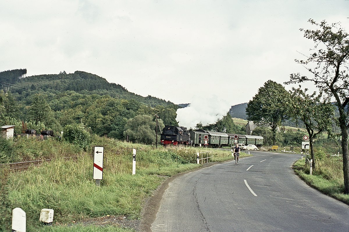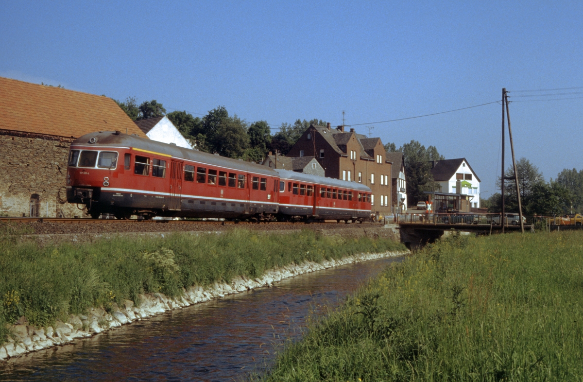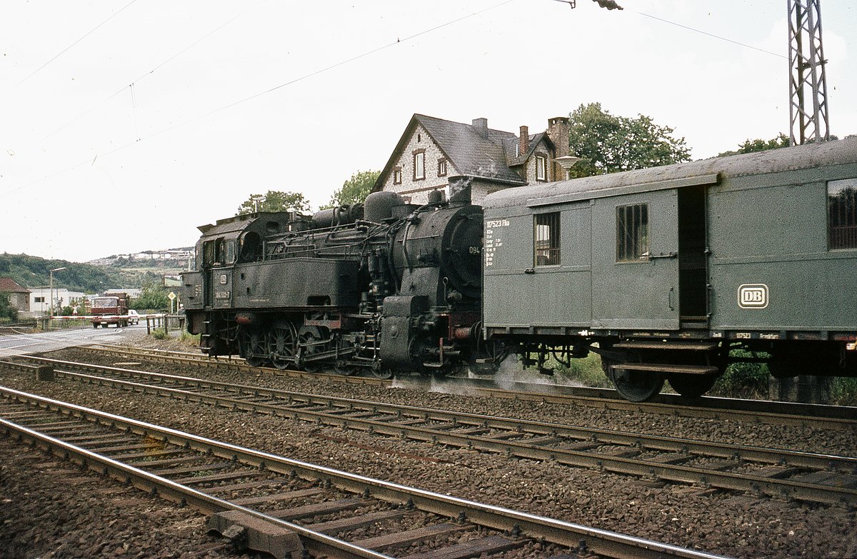 213 341, deren Steilstreckenfähigkeiten auch hier auf der Aartalbahn nicht benötigt wurden, wartet am 21.5.1981 mit ihrer Übergabe Kettenbach - Limburg auf Überholung eines Personenzugs (in Gestalt einer 517-Einheit).
