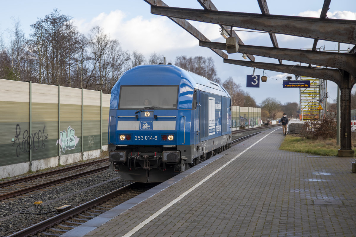 26. Januar 2021 - BR 253 014 des Unternehmens PRESS bei einer Durchfahrt in Varel Gleis 3 in Richtung Wilhelmshaven