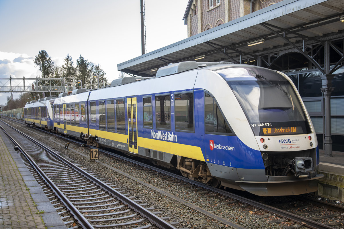 26. Januar 2021 - Nordwestbahn VT 648 074 / RE18 in Varel Gleis 1 auf der Fahrt von Wilhelmshaven nach Osnabrück. Vorne ist VT 648 075