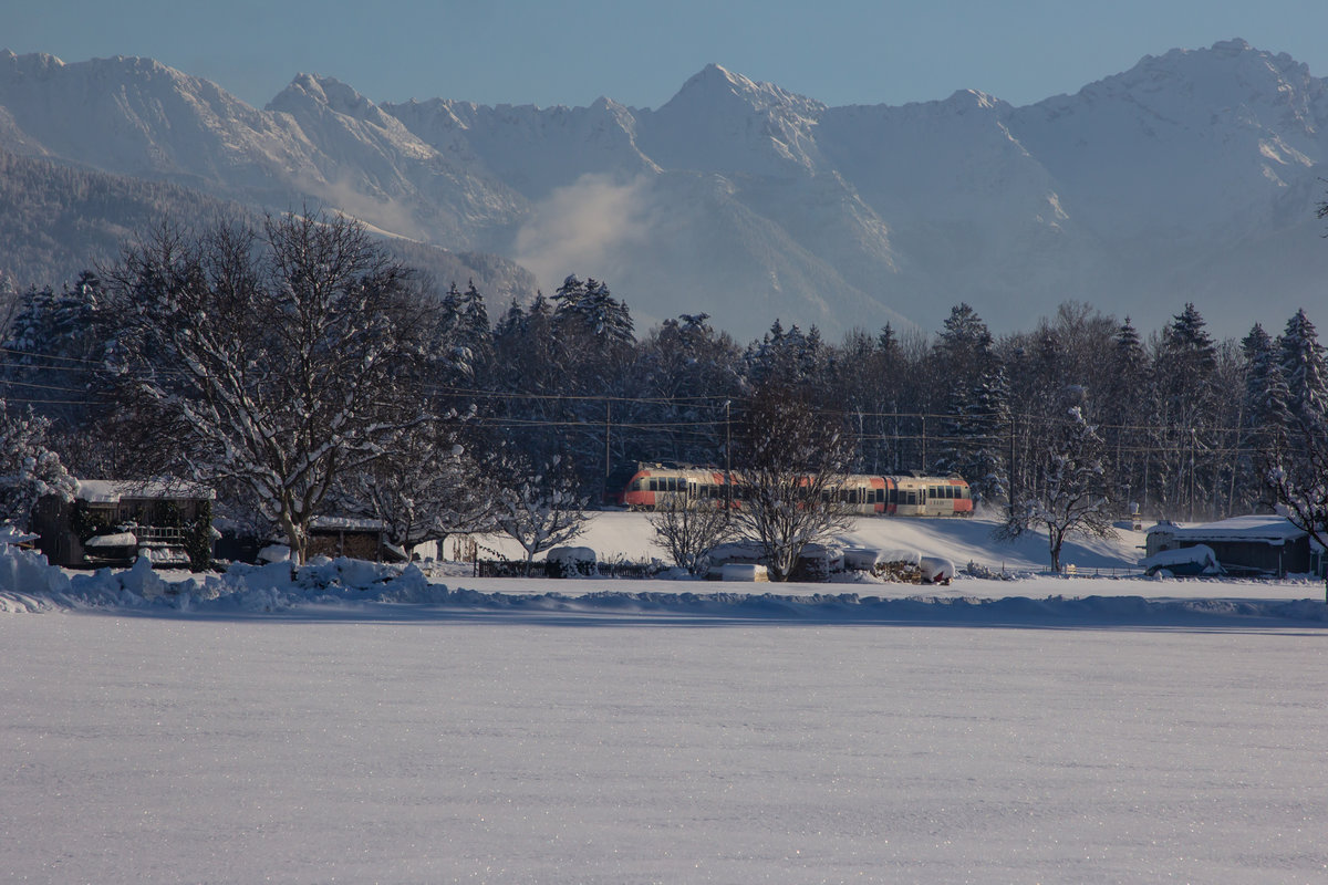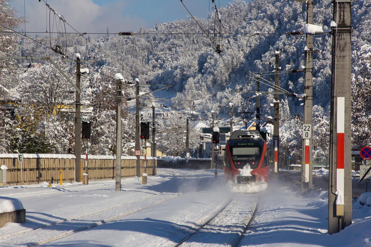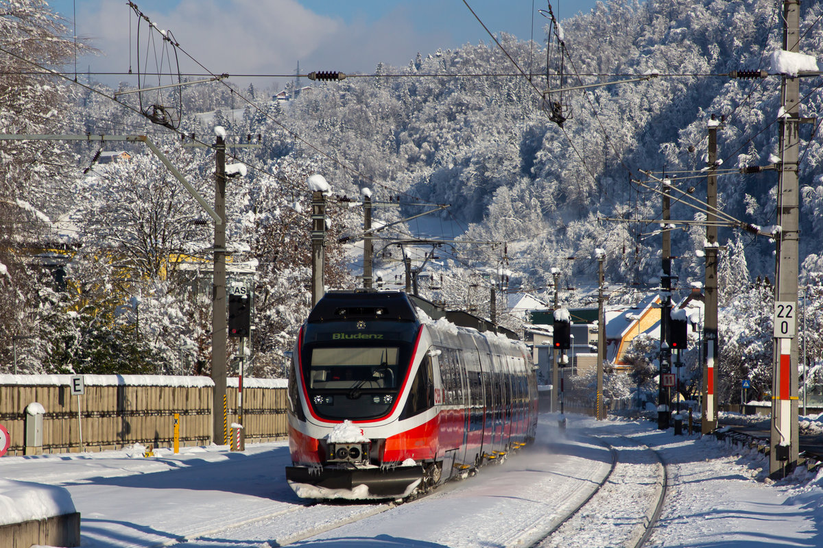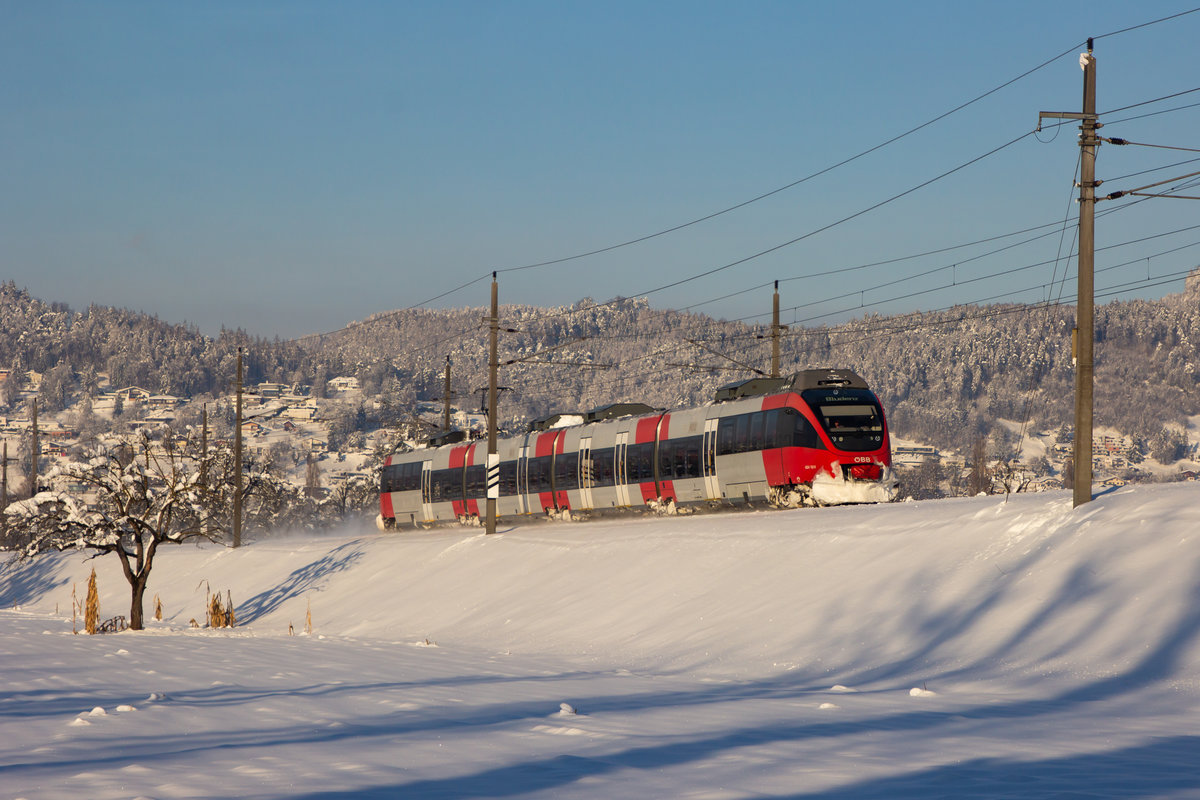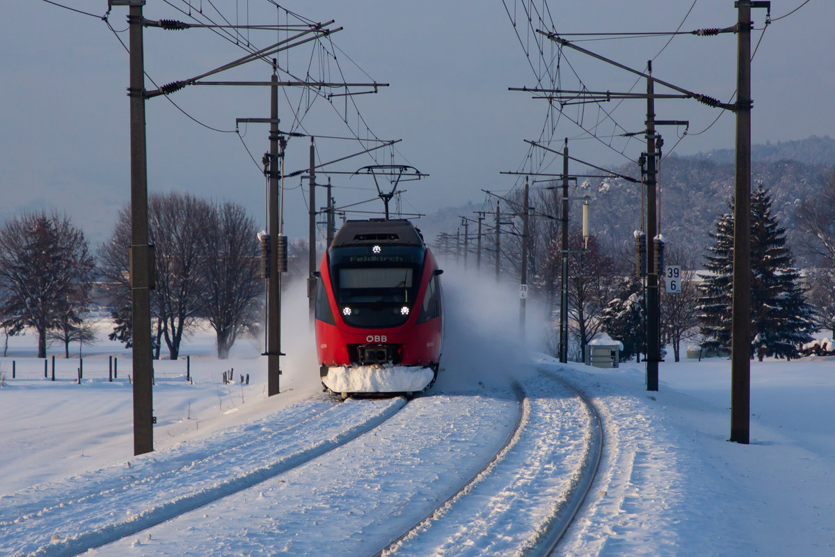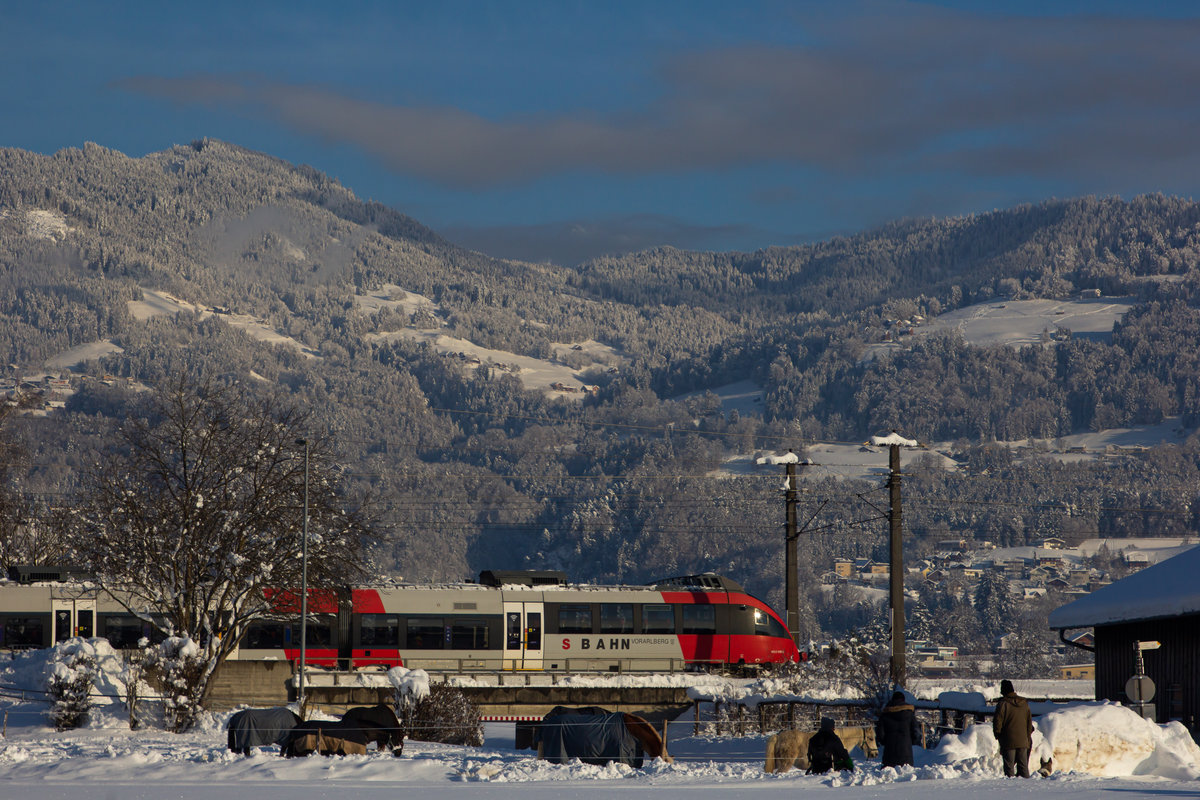 Vor der maleerischen winterlichen Bergkulisse Vorarlbergs fährt ein 4024er nach Feldkirch. Bei Sulz Röthis. 16.01.21