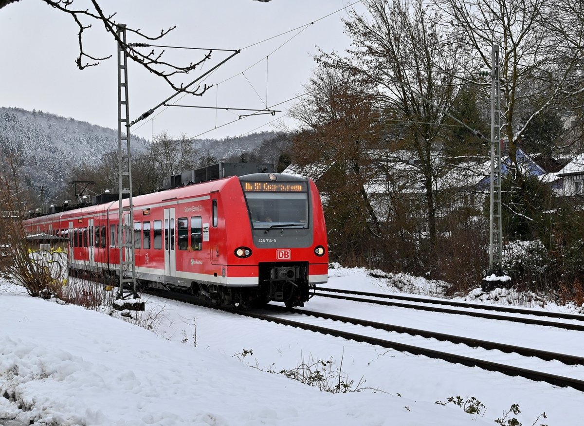 425 713-5 Namens Sinsheim(Elsenz) verlässt im leichten Schneegrieseln Neckargerach als S1 nach Osterburken am heutigen Mittag. Der Zug hat immer noch die Werbeaufkleber für die ausgefallenen Heimattage 2020 in Sinsheim. 26.1.2021
