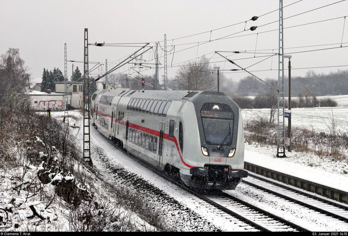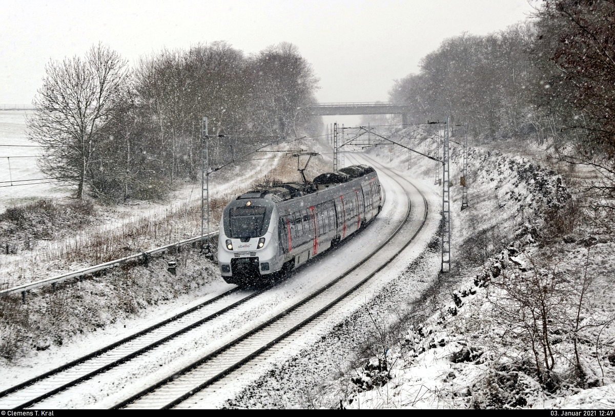 9442 618 (Bombardier Talent 2) durchfährt bei Schneefall den Hp Zscherben auf Gleis 1. 🧰 Abellio Rail Mitteldeutschland GmbH 🚝 RE 74710 (RE9) Halle(Saale)Hbf–Eichenberg 🚩 Bahnstrecke Halle–Hann. Münden (KBS 590) 🕓 3.1.2021 | 13:13 Uhr