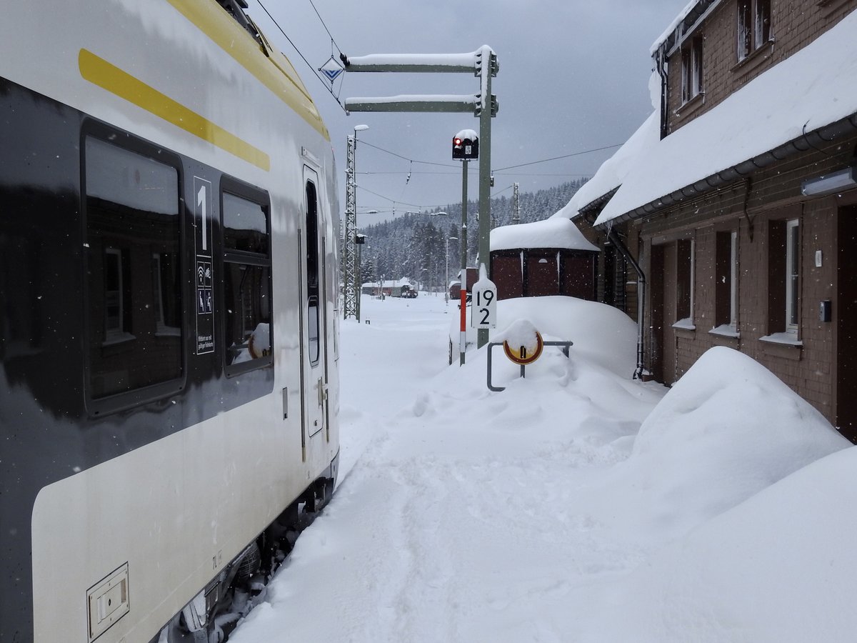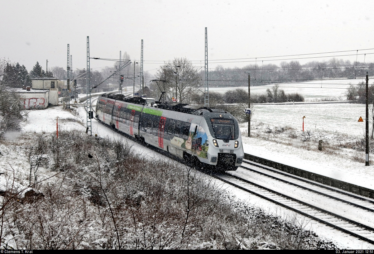 9442 612 (Bombardier Talent 2), mit Werbung für die Harzer Schmalspurbahnen GmbH (HSB), verlässt den verschneiten Hp Zscherben auf Gleis 1. Viele Grüße zurück an den Tf! 🧰 Abellio Rail Mitteldeutschland GmbH 🚝 RB 74776 (RB75) Halle(Saale)Hbf–Lutherstadt Eisleben 🚩 Bahnstrecke Halle–Hann. Münden (KBS 590) 🕓 3.1.2021 | 12:51 Uhr