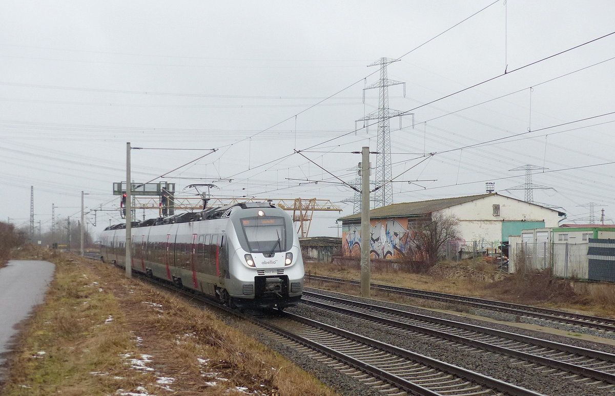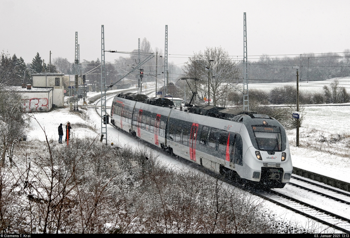Winterlicher Nachschuss auf 9442 605 (Bombardier Talent 2) im Hp Zscherben auf Gleis 2. 🧰 Abellio Rail Mitteldeutschland GmbH 🚝 RE 74731 (RE8) Leinefelde–Halle(Saale)Hbf 🚩 Bahnstrecke Halle–Hann. Münden (KBS 590) 🕓 3.1.2021 | 13:47 Uhr