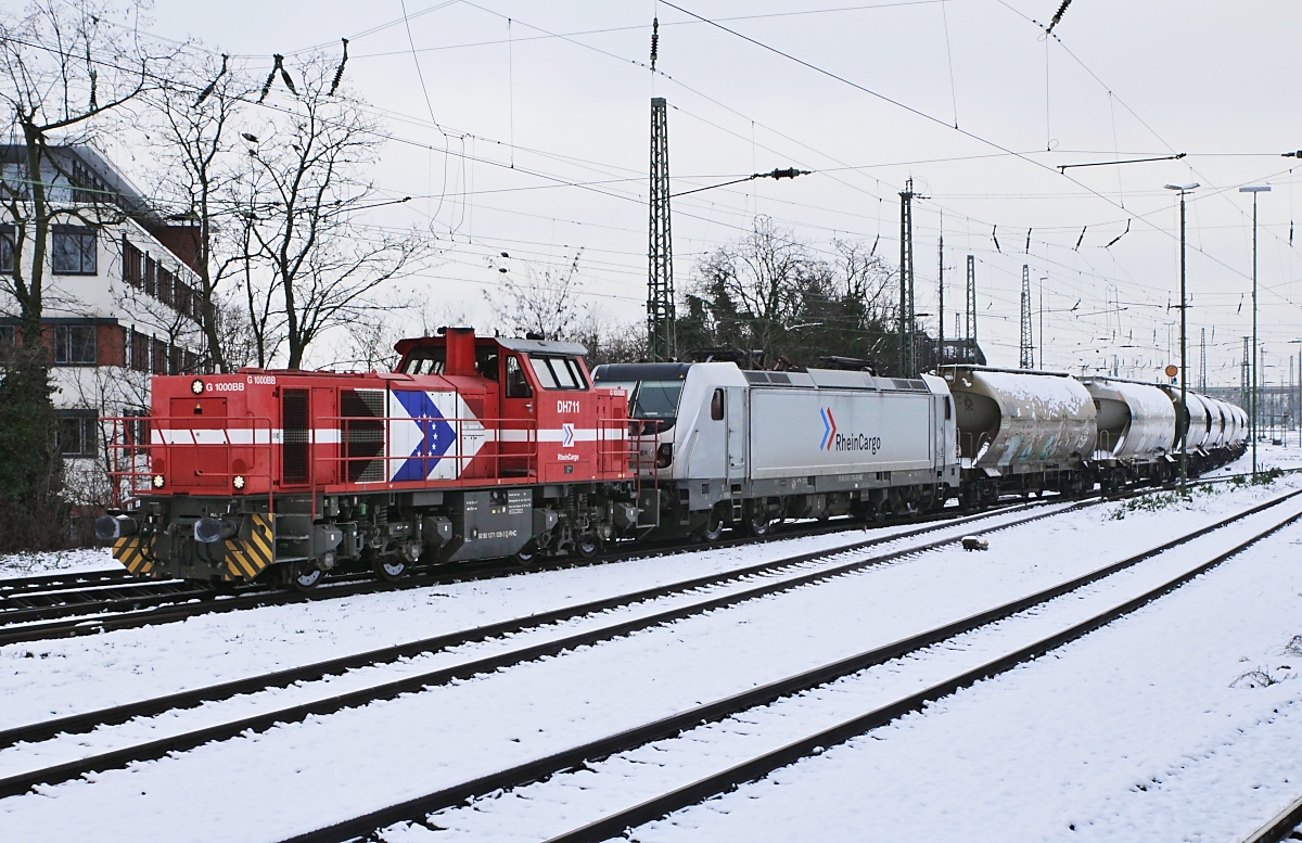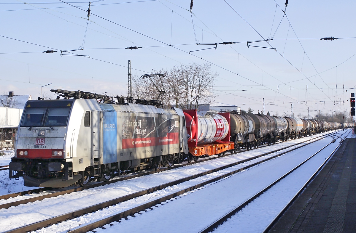 Als fahrende Stellenanzeige ("Een job bij DB Cargo?") eilt 186 499 mit einem Kesselwagenzug in die Niederlande am 24.01.2021 durch Neuss-Norf. Vielleicht stößt ihre Aufforderung bei der Fahrt durchs Nachbarland auf Interessenten.