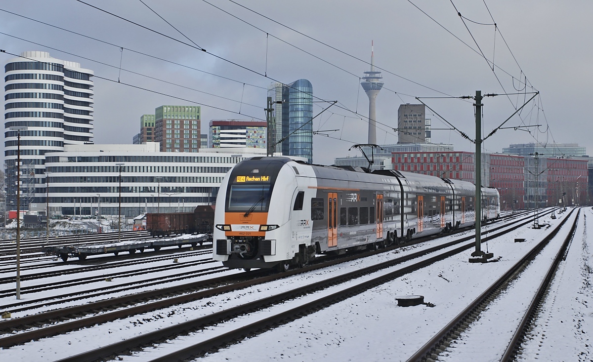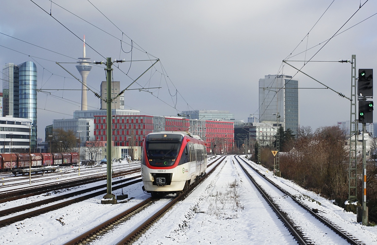 Inzwischen ein alltägliches Bild im Düsseldorfer Raum: Der jetzt von der Regiobahn eingesetzte ex-BOB VT 116 am 24.01.2021 in Düsseldorf-Hamm, im Hintergrund die Rheinbrücke Düsseldorf - Neuss. Die Zielangabe "Kaarster See" ist falsch, der Triebwagen fährt in der Gegenrichtung nach Wuppertal Hbf.. Während meines nicht allzu langen Fototrips fielen übrigens insgesamt 5 S-Bahnen aus (2x S 8, 1x S 11, 2x S 28) und ich lernte dabei die gesamte DB-Poesie kennen: "Verzögerung im Betriebsablauf", "betriebliche Störung", "witterungsbedingte Störung", "Störung am Triebfahrzeug" und "wegen Unfalls".